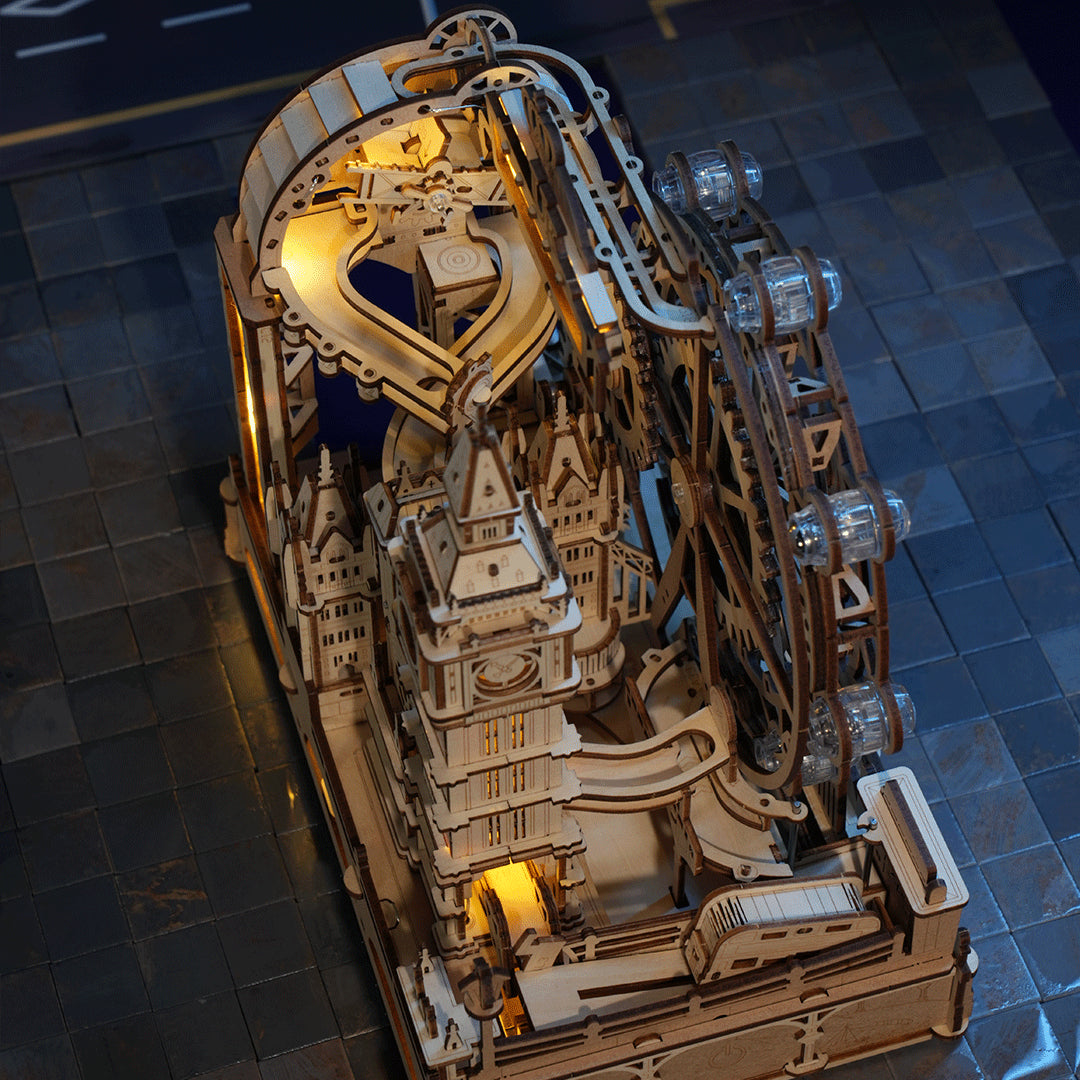 Construisez les attractions célèbres de Londres comme le London Eye, Big Ben et le Tower Bridge grâce à ce circuit à billes en bois 3D à monter soi-même, puis parcourez-les dans un voyage rapide et plein d'adrénaline.